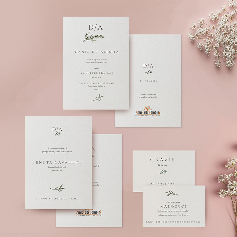 1. partecipazione in formato 12×18 con i nomi degli sposi e la data della cerimonia (stampa fronte e retro).