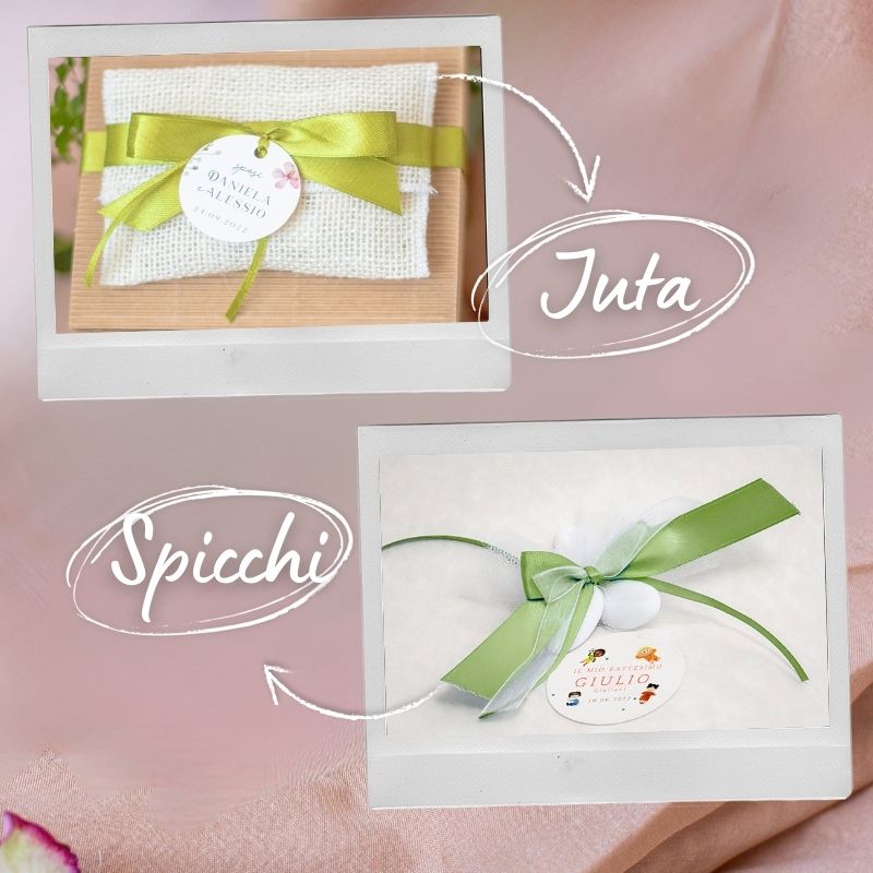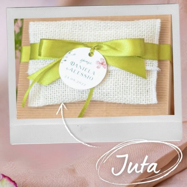 Opzionale: Sacchetto porta confetti “Juta” con 5 confetti mandorla bianchi o “Spicchi” con 3 confetti mandorla bianchi confezionati a mano da Cigno Bianco e relativo nastro di raso del colore a tua scelta tra quelli proposti.