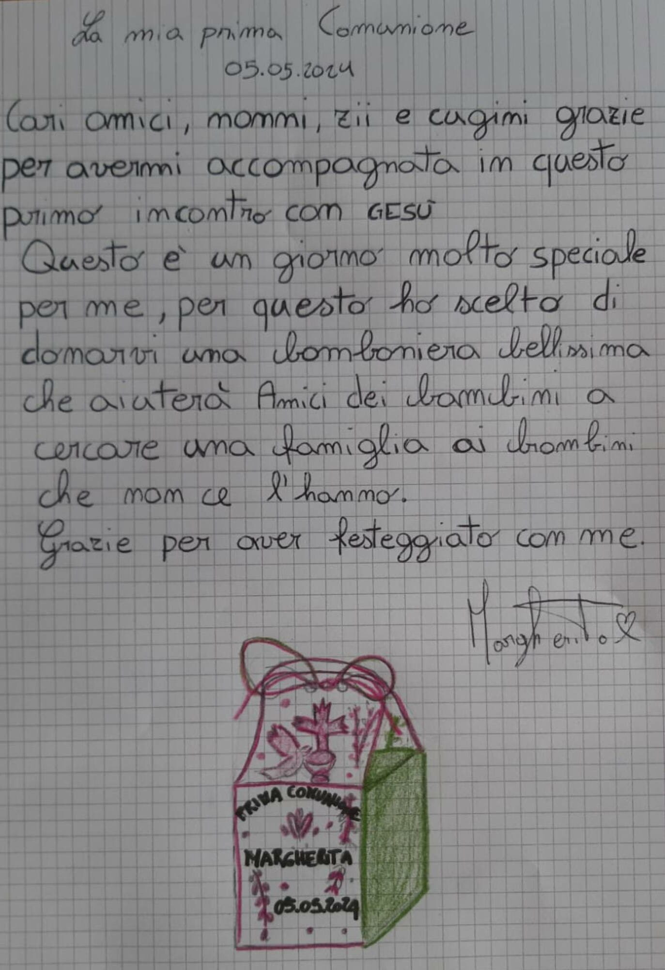 grazie per avermi accompagnata in questo primo incontro con Gesù. Questo è un giorno molto speciale per me, per questo ho scelto di donarvi una bomboniera bellissima che aiuterà Amici dei Bambini a creare una famiglia ai bambini che non ce l’hanno. Grazie per aver festeggiato con me.