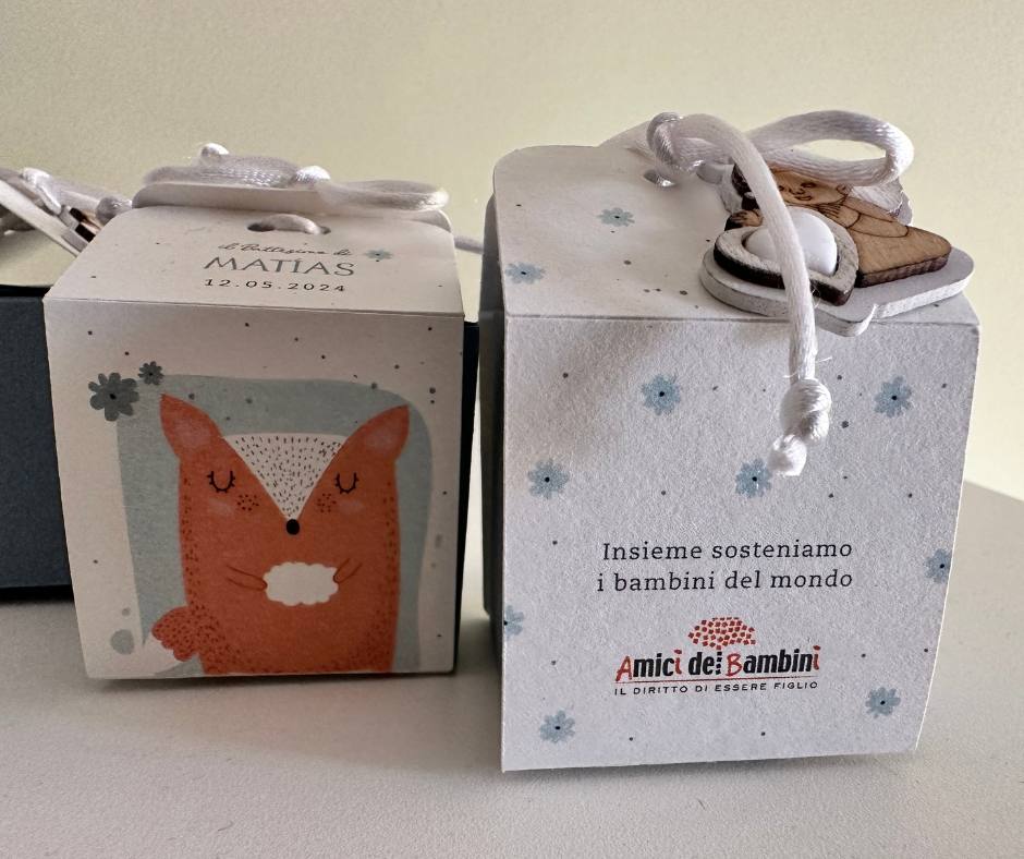 La scatoletta porta confetti “Volpe Azzurro” con cordino mostra come eleganza e solidarietà possano fondersi insieme. Realizzata in carta, questa scatoletta è composta da due elementi distinti ma armoniosi. Da un lato, offre la possibilità di personalizzazione con il nome, la data e il tipo di evento, rendendo ogni bomboniera unica e intimamente legata al festeggiato.