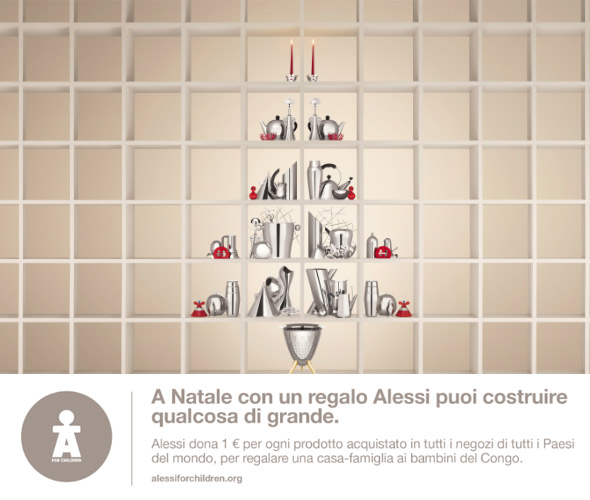 La campagna natalizia 2012 di Alessi è interamente dedicata alla grande operazione di charity per la quale ad ogni prodotto venduto in tutti i negozi di tutti i Paesi del mondo, l’Azienda devolve un euro per questa causa: un impegno non indifferente se si pensa alla consistenza del mercato natalizio della più famosa Fabbrica dei sogni.