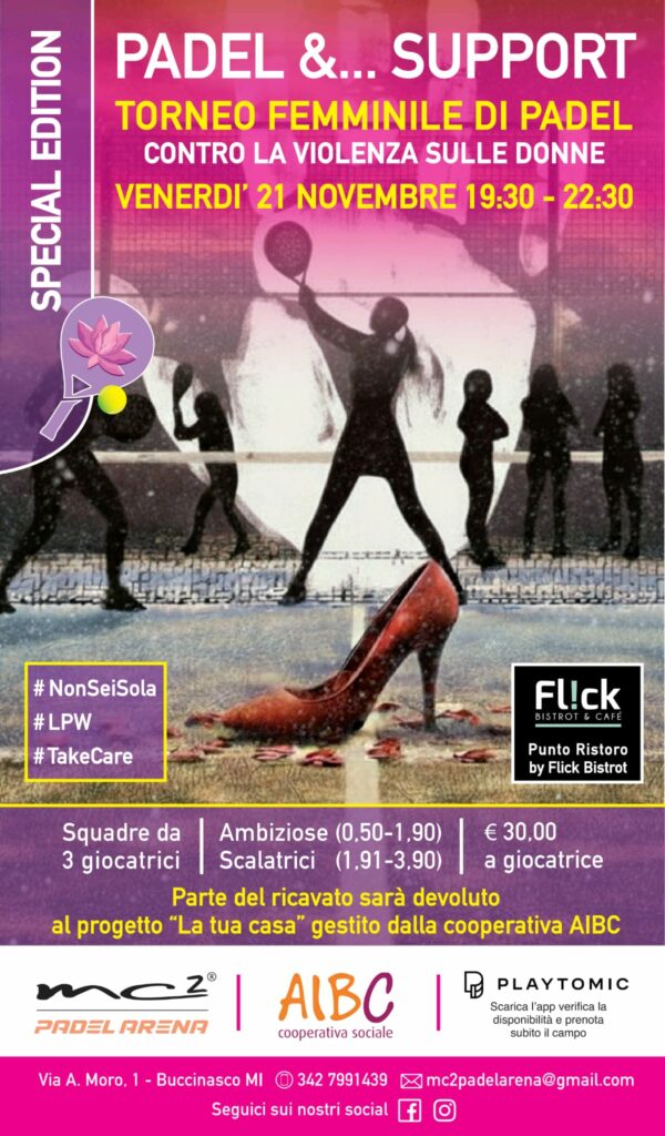 Venerdì 21 novembre dalle ore 19.30 alle ore 22.30, presso il Centro Sportivo MC2 di Buccinasco, in via Aldo Moro 1, si tiene il torneo femminile Padel &… Support  a favore del progetto La tua Casa.