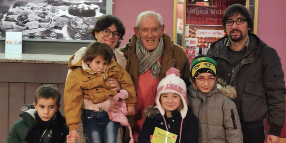 L’abbraccio del maestro Enzo Garinei (la voce di Dio) a una famiglia volontaria di Ai.Bi.!