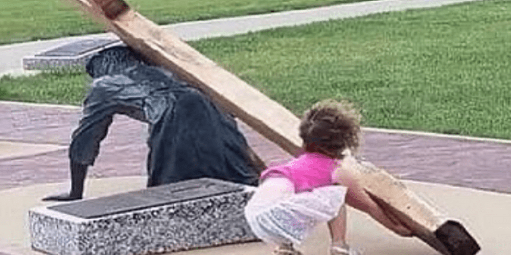 Una bimba che tenta di aiutare una statua di Gesù, ritratto nell’atto di sorreggere la croce, durante la sua Passione. Questa immagine sta girando in internet, accompagnata da una didascalia: “Lei non sa che è una statua e non immagina il suo peso. Lei vede solamente un essere umano che ha bisogno di essere aiutato. Dovremmo guardare tutti il mondo con gli occhi di un bambino”.