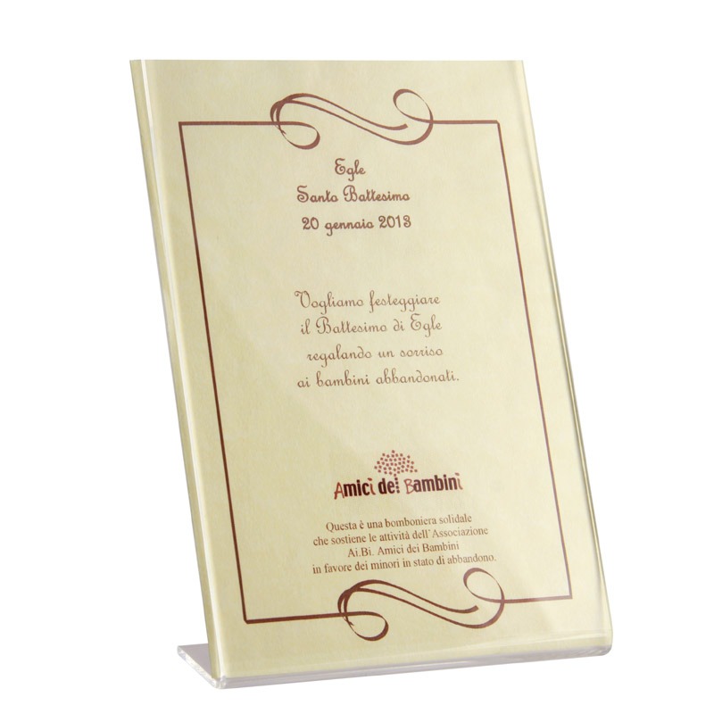 Le pergamene di Amici dei Bambini hanno una dimensione di 10,5×15 cm. Sono disponibili in quattro differenti grafiche, stampate su carta pergamena color crema e personalizzabili con i nomi degli sposi, la data del matrimonio e una frase scelta da voi.