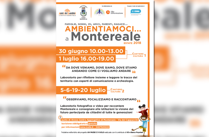 montereale (Aq), l'iniziativa-laboratorio di Ai.Bi. e del comune per la collettivitàDue nuovi ‘cantieri’ aperti per riaffermare e rafforzare il senso di comunità di un paese tra quelli più fortemente colpiti dal sisma, lo scorso anno: è l’iniziativa che Ai.Bi. Associazione Amici dei Bambini organizza insieme al Comune di Montereale per l’Estate 2018, nell’ambito del progetto ‘Un paese ci vuole’. ‘Ambientiamoci’ sarà un laboratorio creativo aperto a tutte le generazioni e che si pone l’obiettivo di divertirsi e cercare insieme i segni, le immagini, le tracce importanti legate alla storia di Montereale e dintorni, da consegnare alle giovani generazioni e, quindi, al futuro.