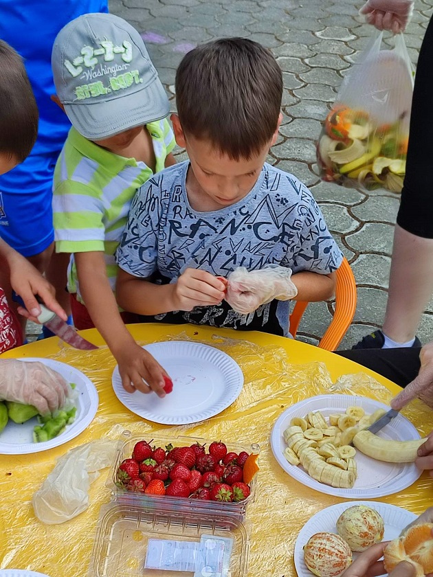 All’interno del campo per gli sfollati dall’Ucraina di Chisinau, in Moldova, che al momento ospita 132 persone, gli animatori di Ai.Bi. organizzano sempre mille attività. Anche in cucina. Nel menù: macedonia di frutta