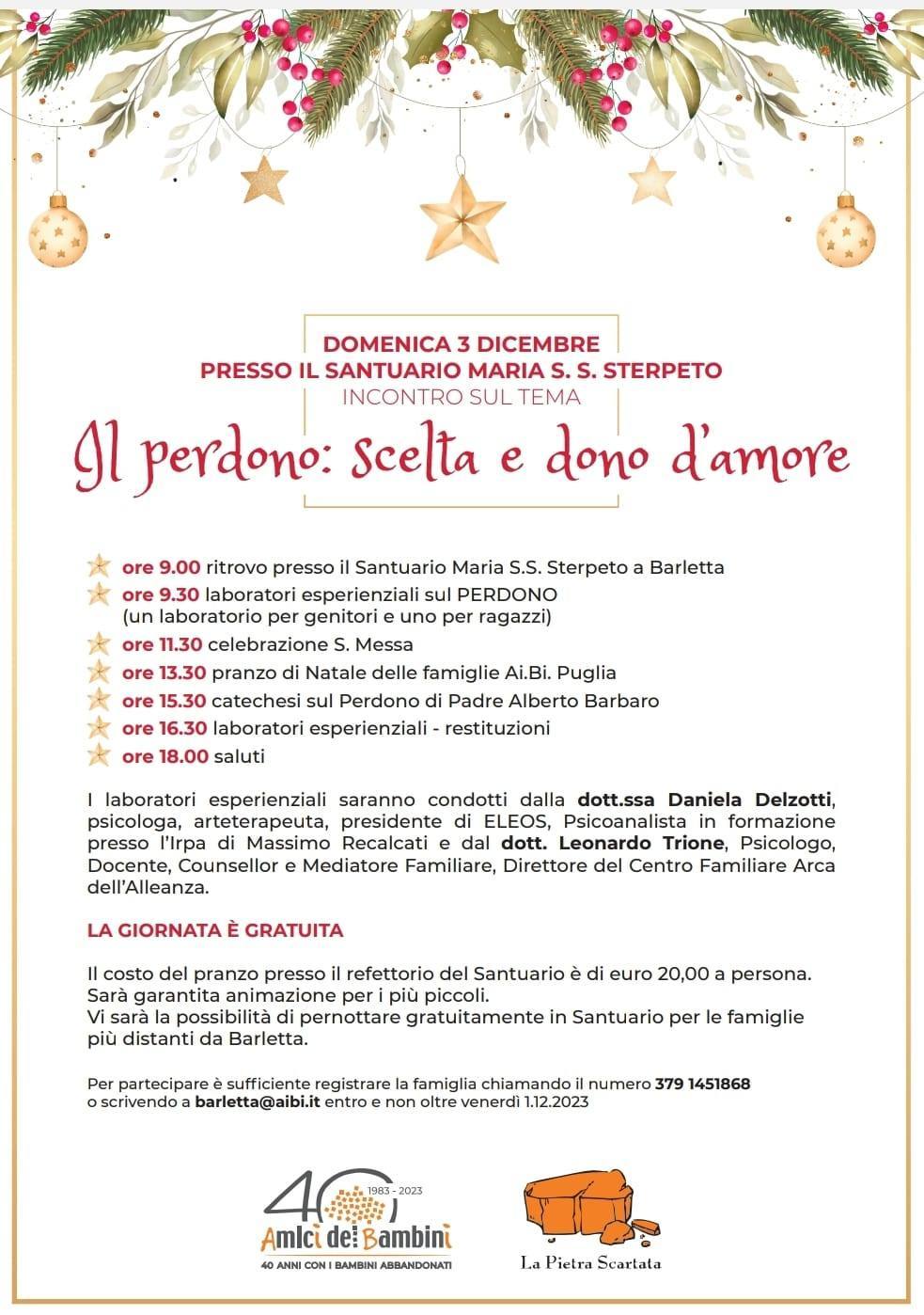 Domenica 3 dicembre, presso il Santuario Maria S.S. Sterpeto di Barletta, si terrà un incontro dedicato al tema del perdono, organizzato dalle famiglie adottive di Ai.Bi. Puglia. Una giornata di festa, di fede e di crescita insieme