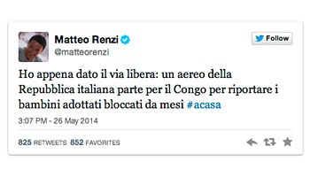 renzi_twitterQuesta sembra essere davvero la volta buona. Poco dopo le ore 15 di oggi, il premier italiano Matteo Renzi ha twittato un messaggio che restituisce la speranza alle 24 coppie italiane che hanno lasciato i loro figli adottivi nella Repubblica Democratica del Congo.
