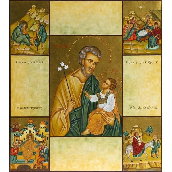 Icona stampata con tecnica litografica, su foglia oro 23 Kt. + cartolinaFormato:380X415mm.L’icona rappresenta Giuseppe che reca in braccio il Cristo benedicente mentre nella destra tiene il giglio, simbolo dell’amore verginale. Tra i due corre un tacito dialogo, come tra adulti, perché il Figlio non ha tratti decisamente infantili. Giuseppe racconta al figlio adottato la vicenda della sua paternità adottiva. L’icona viene fornita con una cartolina per la contemplazione.
