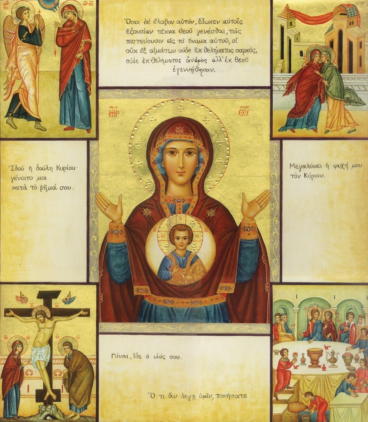 Icona stampata con tecnica litografica, su foglia oro 23 Kt. + cartolinaFormato 380X415mm.L’icona, il cui originale è stato realizzato nel 2009 dalle monache benedettine del Monastero Mater Ecclesiale dell’Isola San Giulio sul Lago d’Orta, illustra attraverso il percorso delle quattro tappe compiute da Maria, l’istituzione dell’adozione nel nome di Gesù. L’icona viene fornita con una cartolina per la contemplazione.